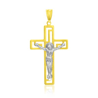 A beautifully crafted crucifix pendant is showcasing the classic figure and background with geometric cutout detailing. Made of 14k white and yellow gold.