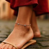 Nine round white cubic zirconias give this chain anklet an air of effortless sophistication. Measuring 10 Inches, this 14k white gold beauty is secured with a lobster clasp.