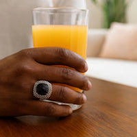 Cable style bordered.05ct diamonds highlight the popcorn inspired texture and cushion black onyx of this gorgeous ring. Amazingly stylish in 18k yellow gold and sterling silver, this is available in sizes 7 to 9.