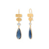 Holiday party perfect! 14 karat gold plated sterling silver drop earrings feature 25mm x 10mm blue glass pear drop with a 5mm x 7mm oval chalcedony. Earrings have a hanging length of 66mm. .925 Sterling Silver