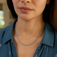 This classic rhodium plated chain is crafted in gleaming sterling silver and has a width of 3.0 millimeters featuring a curb chain design is secured with a lobster clasp.
