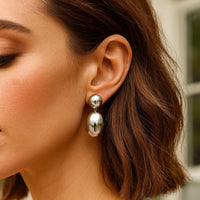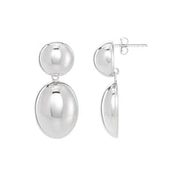 Elegant sterling silver rhodium plated puffed oval double button drop earrings featuring a smooth, polished finish and gracefully layered design. The puffed oval shapes add depth and shine, while the rhodium plating enhances brilliance for timeless sophistication.