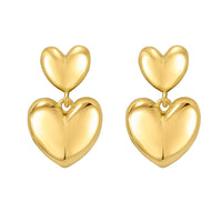 Charming sterling silver yellow gold plated puffed double heart drop earrings featuring two connected puffed hearts with a radiant polished finish. The warm golden hue adds a touch of romance and shine, creating an elegant and timeless statement piece.