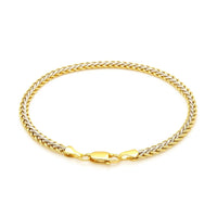 The shine of yellow and white gold links adds contrast to a classic wheat chain bracelet. Secured with a lobster clasp.